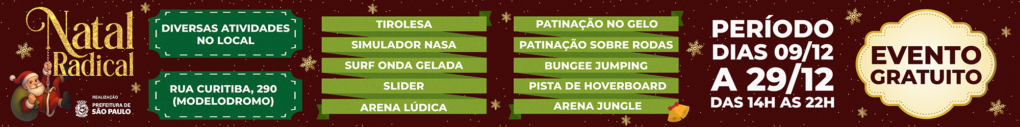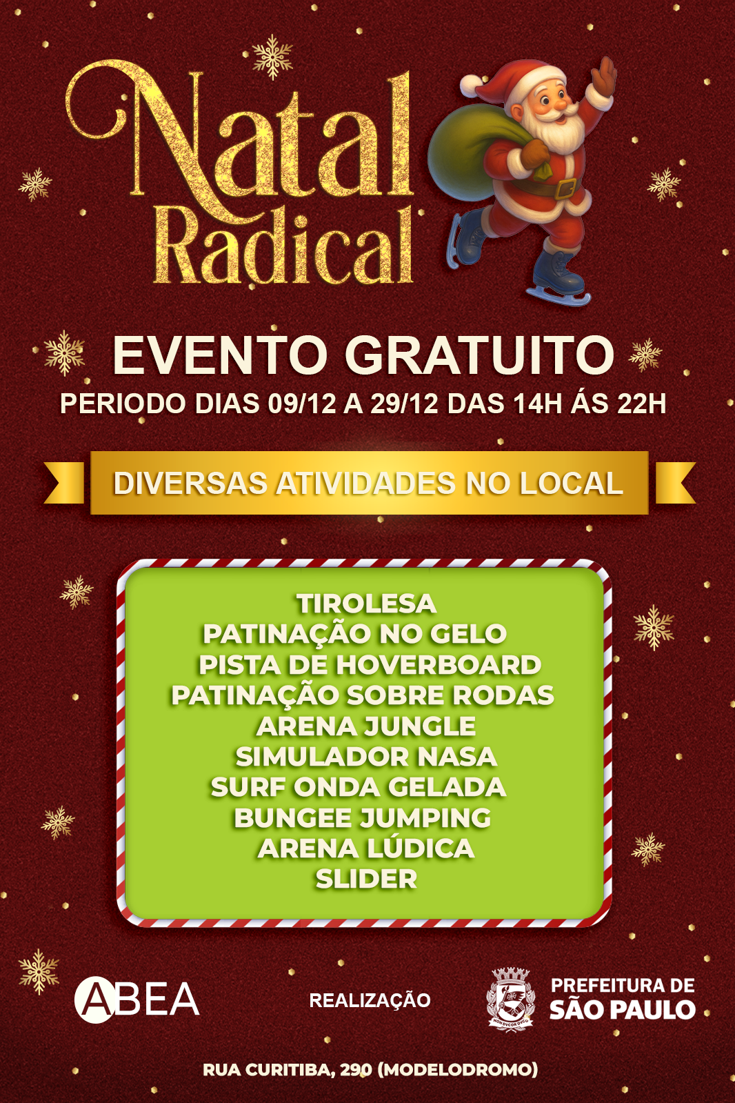 Pela presente, declaro expressamente ou o responsável legal, no caso de menor de idade, meus responsáveis, que tenho conhecimento de que minha participação no evento denominado Natal Radical, a ser realizado nos dias 09 à 23 de dezembro, envolve riscos de natureza física e material, assumindo nesta oportunidade toda e qualquer responsabilidade com relação aos mesmos. Tendo conhecimento dos riscos inerentes às atividades aqui realizadas, mesmo praticadas com a estrita observância de todas as normas de segurança que regem essas atividades, isentando todos os realizadores do evento, e a organização local, de quaisquer responsabilidades com relação a danos físicos e/ou morte ocorridas durante a participação no Evento, danos materiais e/ou danos morais que venha a sofrer em decorrência da mesma, firmo a presente.
